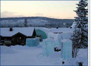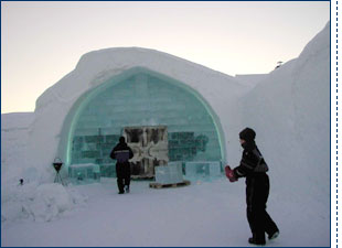中央のドーム型の氷の建物がアイスホテルの入口である。まるで海のように緑色をした氷だ。 神秘的な風情がある。入口はトナカイの毛皮で出来ている。不思議な世界の始まりだ。
