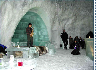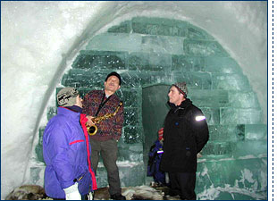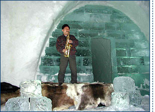 30分演奏したが、アンコールをやれという。右側はアイスホテルの社長、左はここの重要人物でオーケーという男だ。オーケーは以前然別湖で会っている。 アイスバー“うたかたの夢“でサックス吹いた時にいたのだ。だから、俺が「ではこの場所にもっともふさわしい曲を演奏します」といって ”サマータイム“を吹いた事を知っている。 その時は皆に馬鹿受けした。だから、、リクエストしに来たのだ。「オーケー、俺は寒いっちゅーに!」