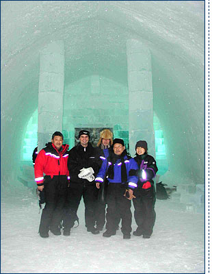 ユッカスヤルビ視察団の面々が記念写真に収まる。左から二人目はここに出稼ぎに来ているアメリカ人。 実はここには世界中からいろいろな人が仕事に来ている。左端の人物がこのホテルの建設に欠くことのできない技術者、崎野隆一郎である。 我々はそのうちここでなんかやろうというわけである。さてねえ!?