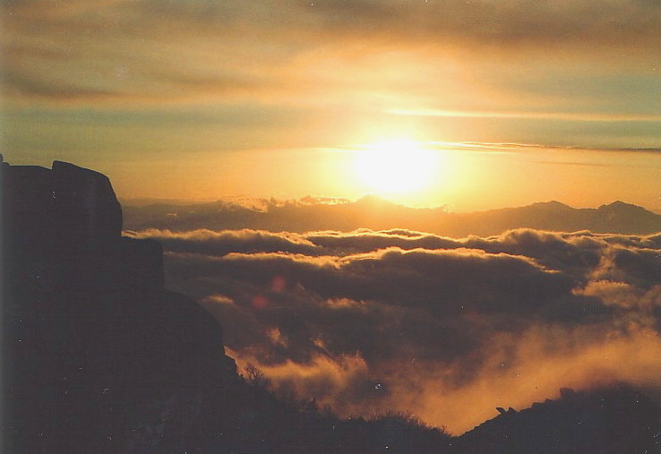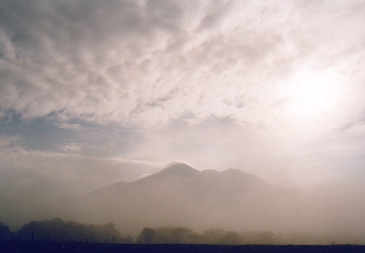夏にキャンプした早朝、ひうち岳の後ろからでる朝日を