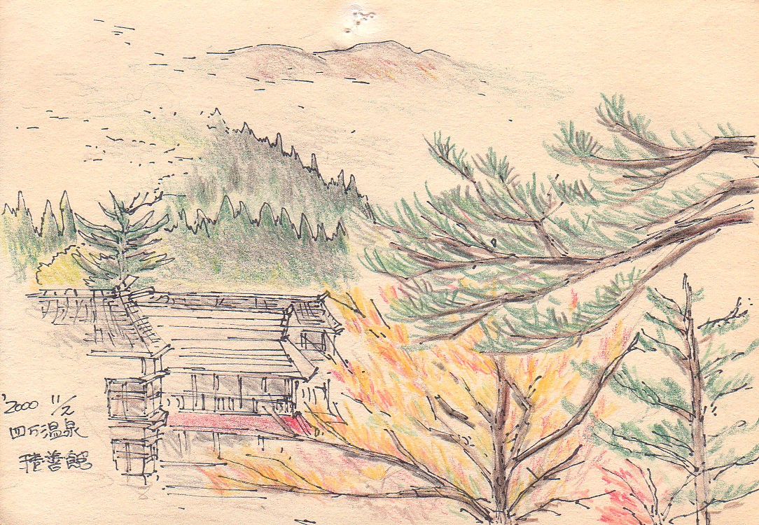 旅館の窓から本館を描いたようだ。