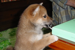 名前は「アコ」、我が家では柴犬のメス、3代目になります。夫の指を甘噛みしています。